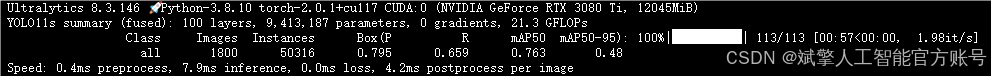--batch 8:每批次8张图像。--epochs 100:训练100轮。--datasets/data.yaml:数据集配置文件。--weights yolov11s.pt:初始化模型权重,yolov11s.pt是预训练的轻量级YOLO模型。