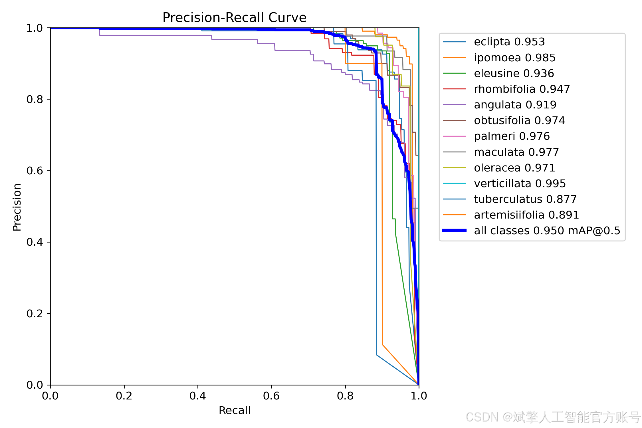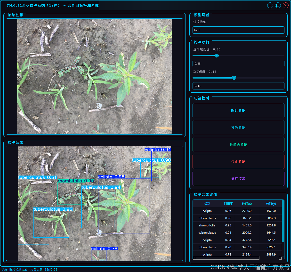 本文基于YOLOv11深度学习框架,设计并实现了一套高效的杂草识别检测系统,旨在解决农业领域中杂草精准识别的实际问题。系统采用改进的YOLOv11算法,结合包含12类杂草(如eclipta、ipomoea等)的数据集(训练集2796张、验证集523张)。系统集成用户友好的UI界面,支持登录注册功能。实验表明,模型在验证集上达到较高精度(mAP@0.5为95%),显著优于传统方法。本研究为智慧农业中的杂草管理提供了自动化解决方案,代码与模型均已开源。
