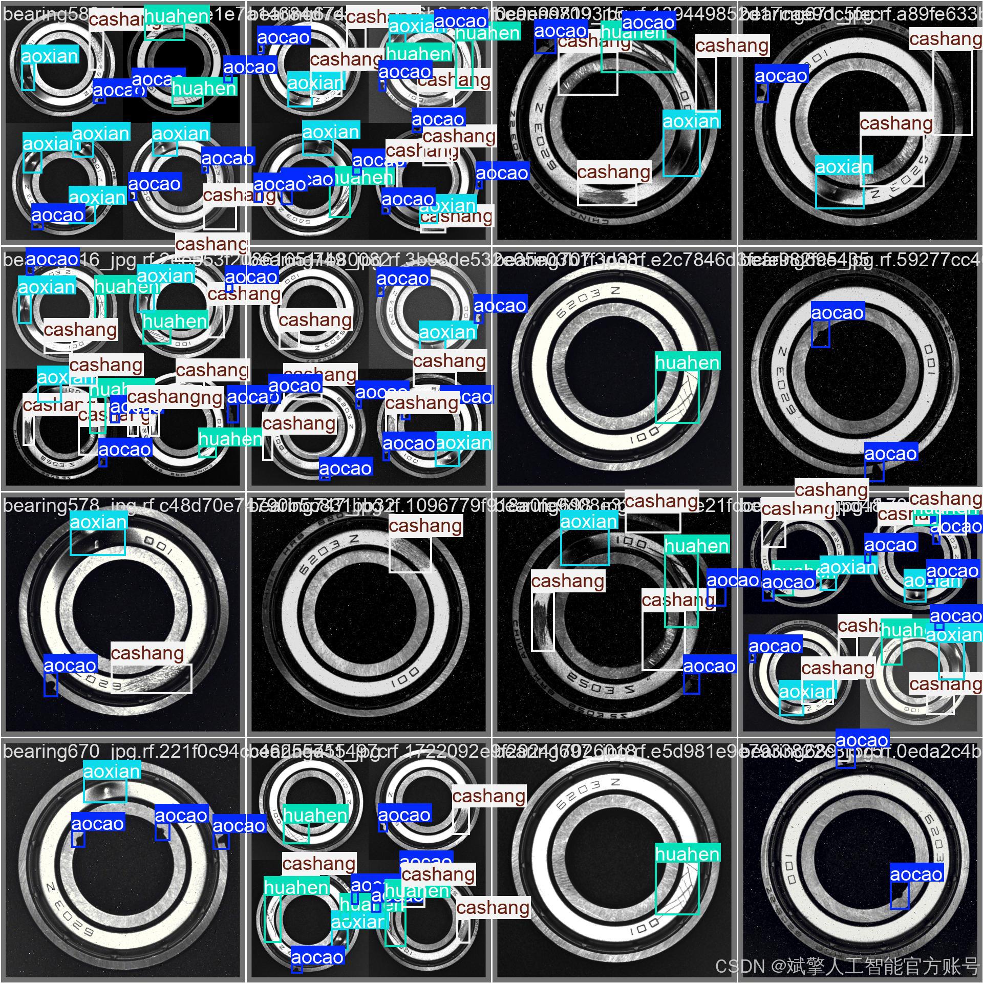 本研究所使用的轴承缺陷检测数据集包含4类常见轴承表面缺陷,分别为凹槽(aocao)、凹陷(aoxian)、擦伤(cashang)和划痕(huahen)。数据集总计1,085张高质量标注图像,其中训练集759张(70%),验证集326张(30%),确保模型训练和评估的充分性。