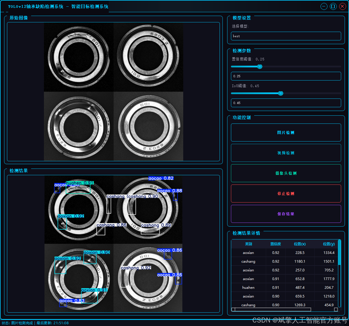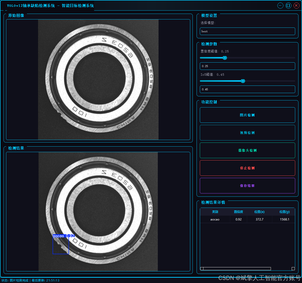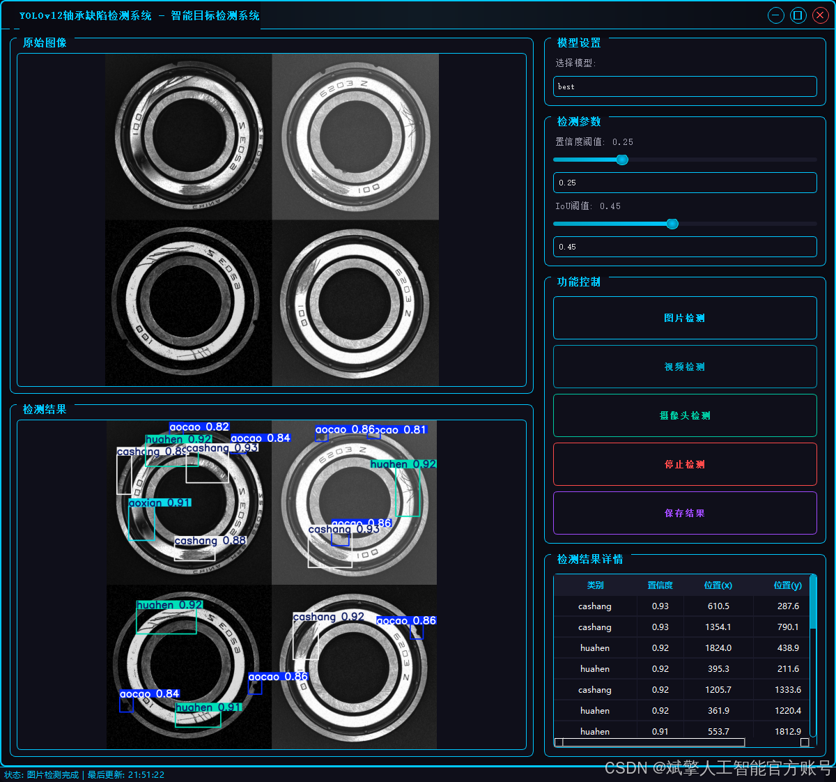 本文基于最新的YOLOv12算法,构建了一套轴承缺陷智能识别系统。该系统采用包含4类缺陷(aocao、aoxian、cashang、huahen)的数据集进行训练和验证,其中训练集759张、验证集326张,确保模型具备良好的泛化能力。此外,系统设计了直观的UI界面,并集成登录注册功能。实验证明,该系统能够实现高精度的轴承缺陷检测,为工业质量控制提供了智能化解决方案。