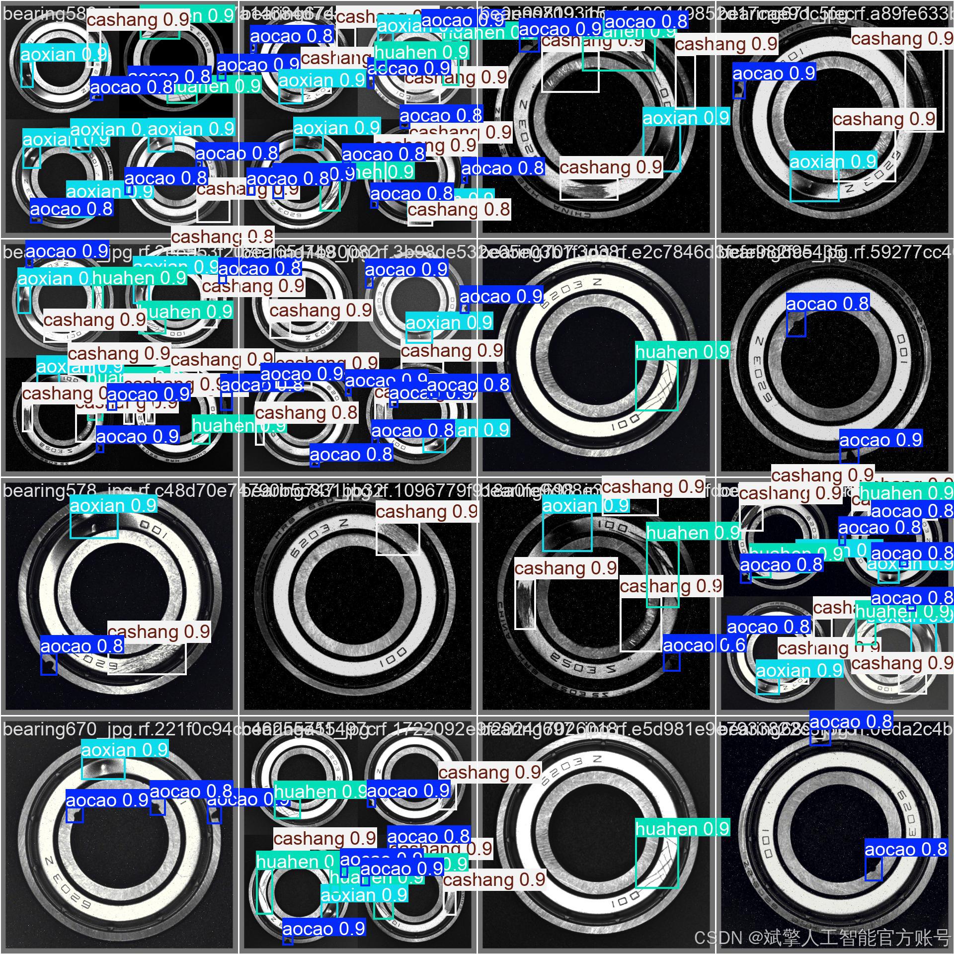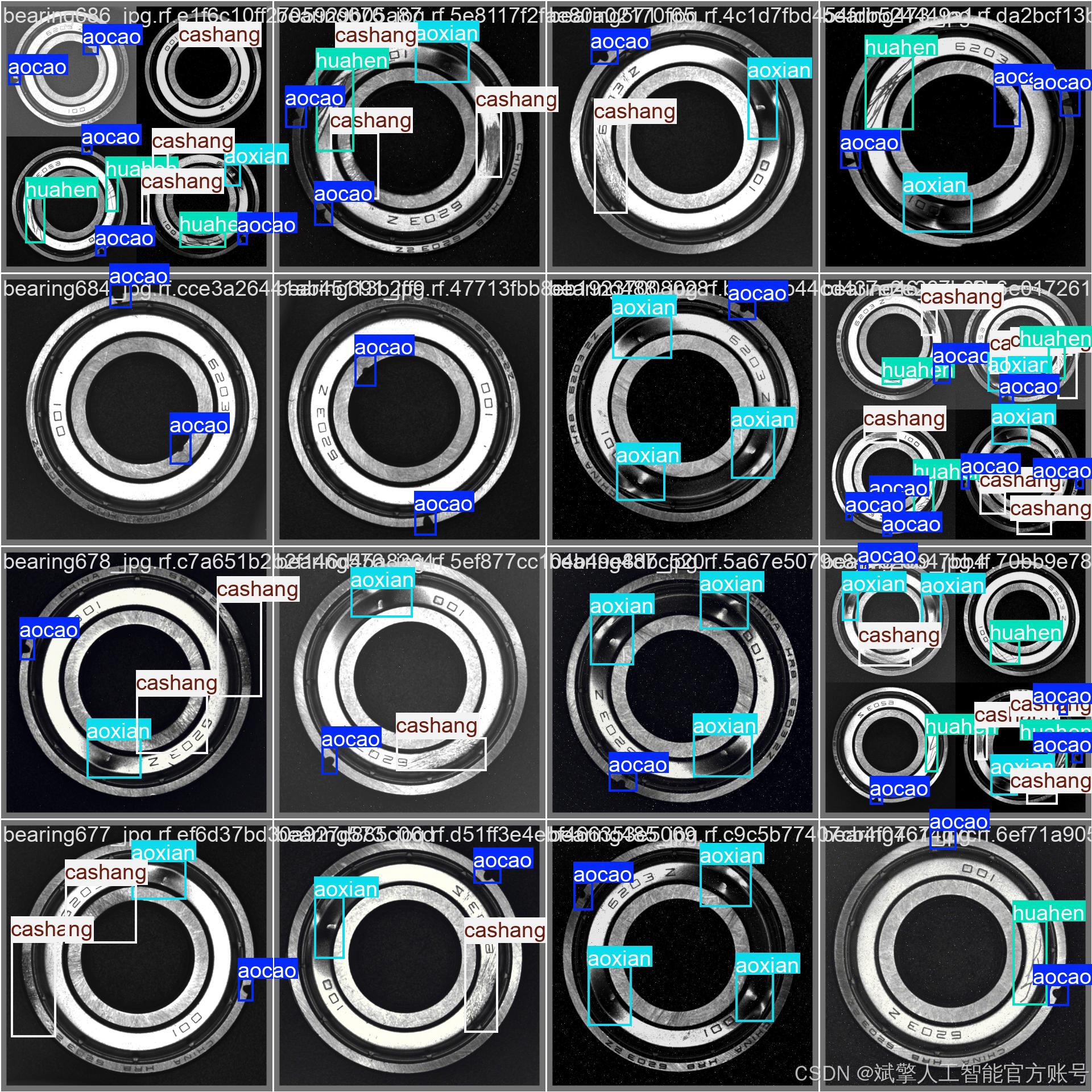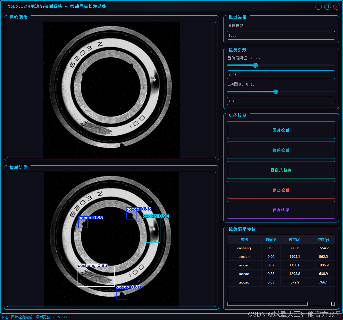 本文基于最新的YOLOv12算法,构建了一套轴承缺陷智能识别系统。该系统采用包含4类缺陷(aocao、aoxian、cashang、huahen)的数据集进行训练和验证,其中训练集759张、验证集326张,确保模型具备良好的泛化能力。此外,系统设计了直观的UI界面,并集成登录注册功能。实验证明,该系统能够实现高精度的轴承缺陷检测,为工业质量控制提供了智能化解决方案。