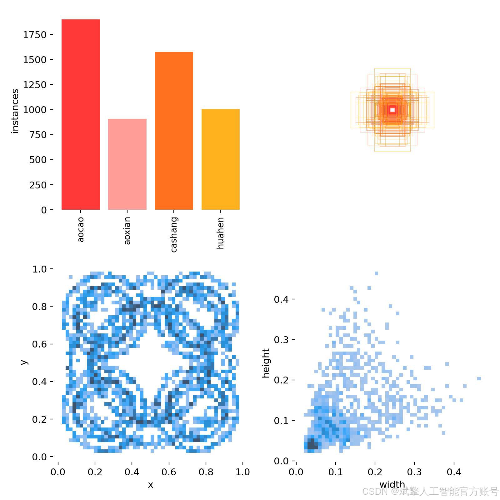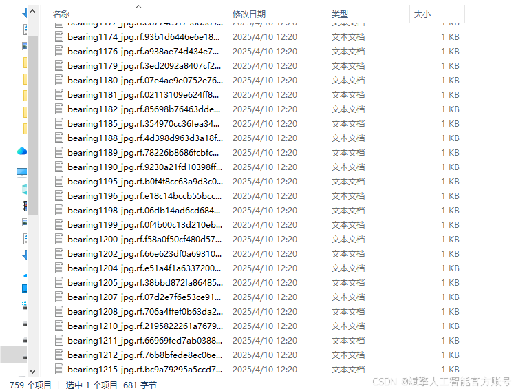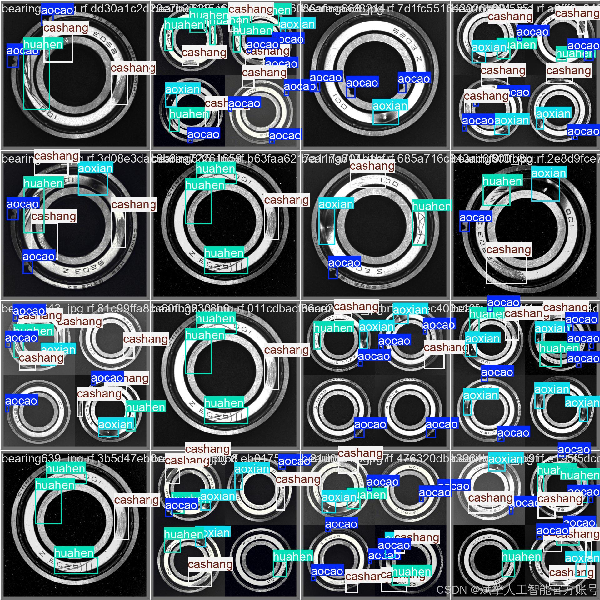 本研究所使用的轴承缺陷数据集共包含 1,085 张 高分辨率工业图像,涵盖轴承表面常见的 4 类缺陷:凹槽(aocao)、凹线(aoxian)、擦伤(cashang)和划痕(huahen)。数据集按照 8:2 的比例 划分为 训练集(759 张) 和 验证集(326 张),以确保模型训练和评估的可靠性。