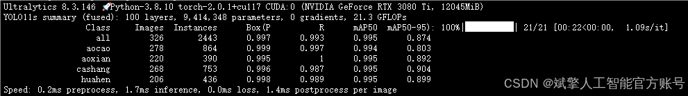 --batch 8:每批次8张图像。--epochs 100:训练100轮。--datasets/data.yaml:数据集配置文件。--weights yolov11s.pt:初始化模型权重,yolov11s.pt是预训练的轻量级YOLO模型。