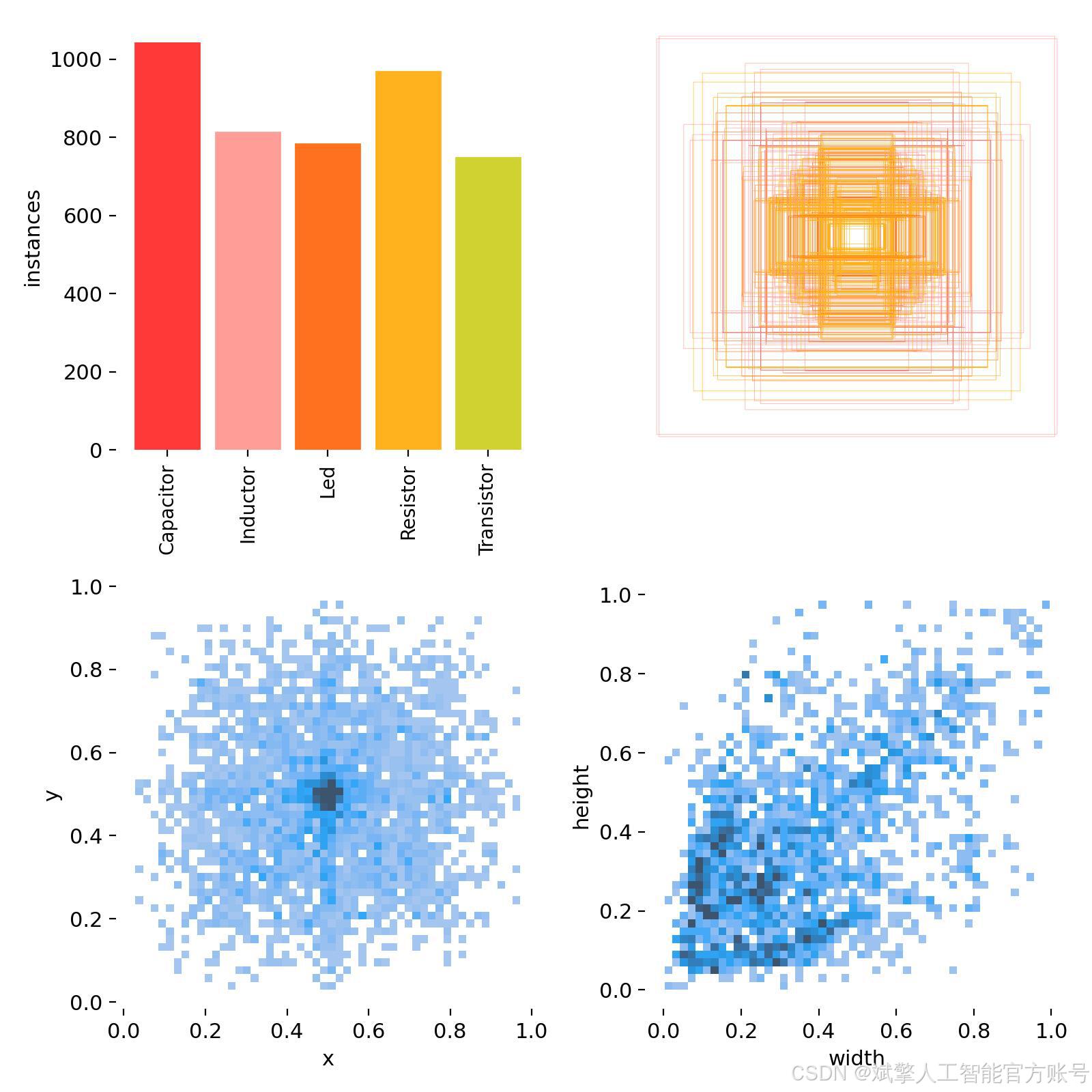 本系统采用YOLO格式标注的电子元器件数据集,包含5类常见电子元器件:电容器(Capacitor)、电感(Inductor)、发光二极管(Led)、电阻(Resistor)和晶体管(Transistor)。数据集总计 2,426 张图像,按照 8:1:1 的比例划分为训练集、验证集和测试集,具体分布如下: