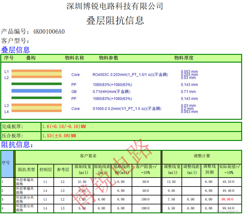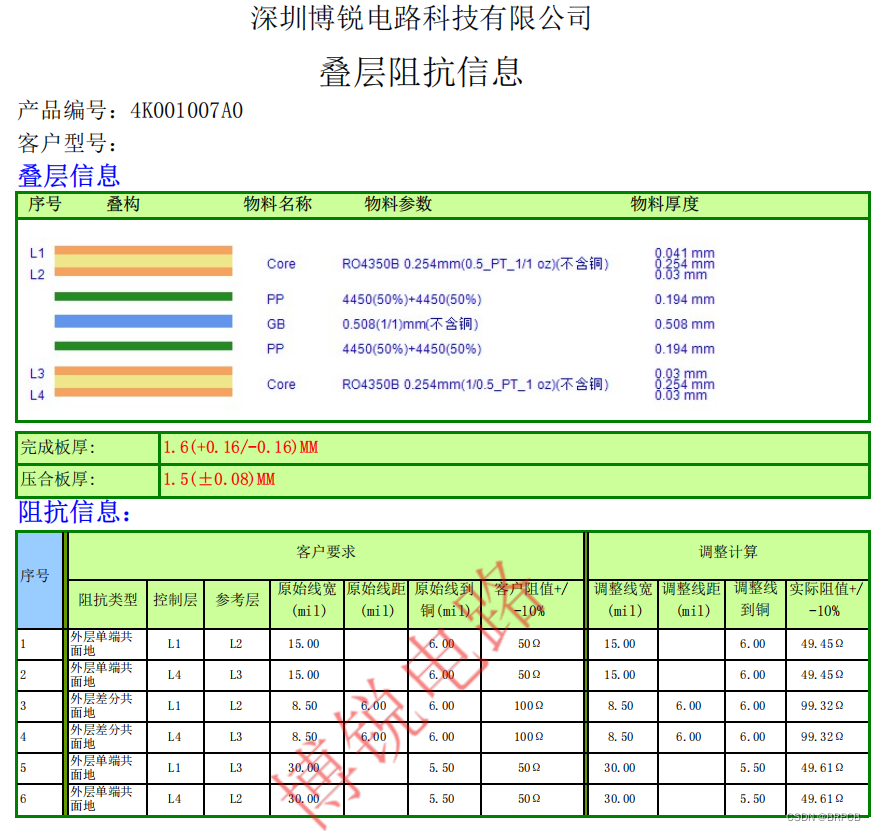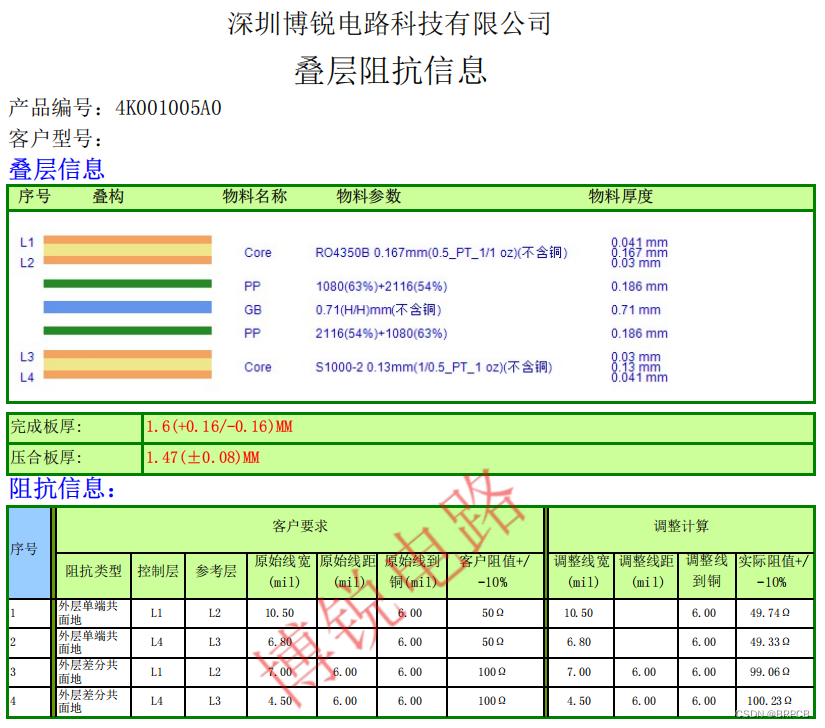 小编从事PCB工程12年,计算模拟的阻抗PCB板子数以万计,影响阻抗的主要因素有:板材型号(介电常数)、介质厚度、铜厚、阻焊油墨厚度、PP半固化片流胶、残铜率、参考层等,以下为一些常规的四层PCB板叠层阻抗结构(粗线板、细线板、RO4350B混压板、纯RO4350B板、RO4003C混压板)供电子工程师参考,如有其它的板子(HDI任意阶阻抗)需阻抗模拟与我私信。