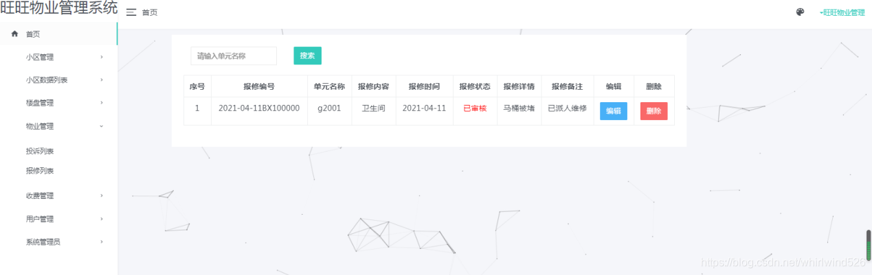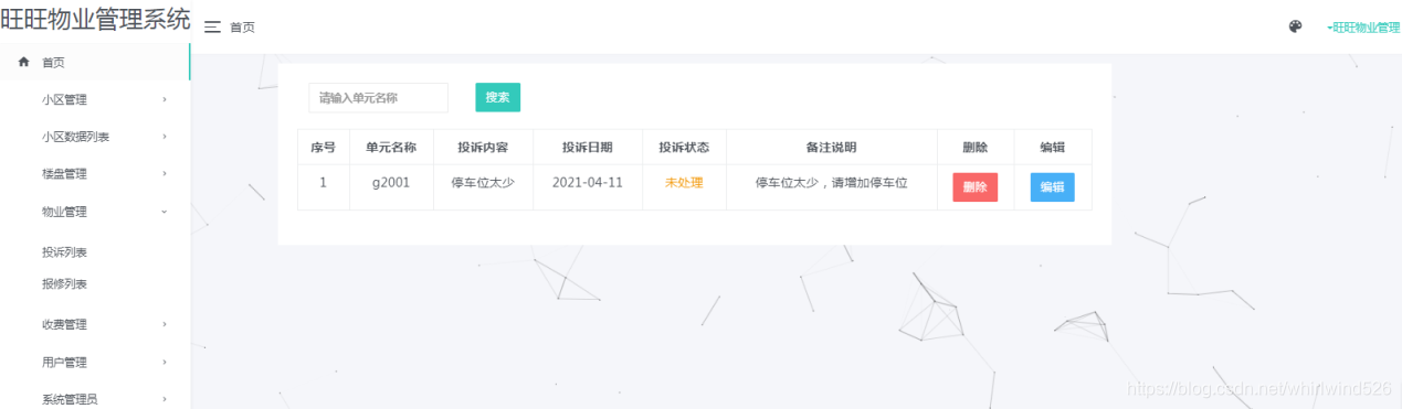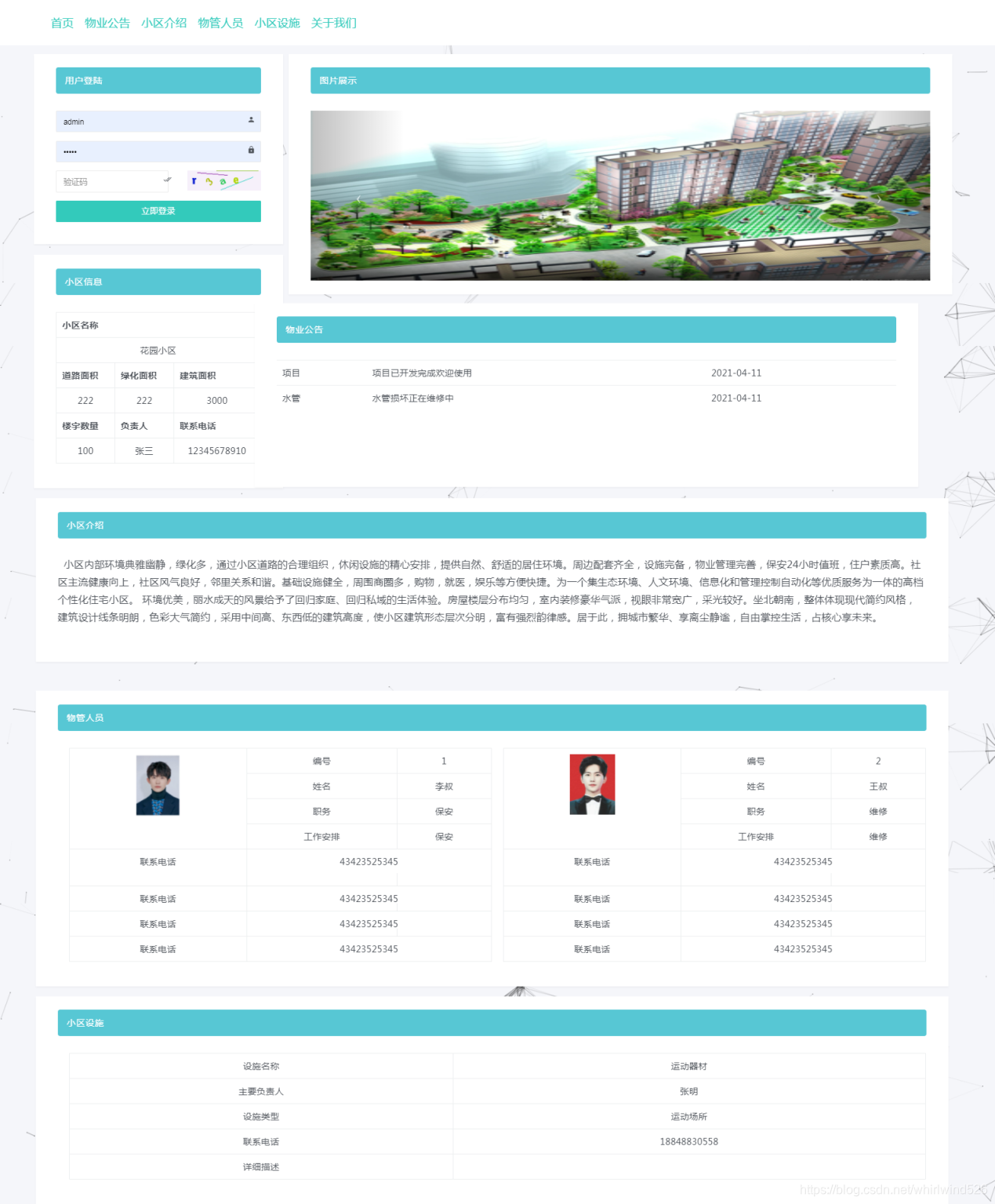 本系统基于SSM框架开发设计一套小区物业管理系统平台,系统分为前端小区信息展示及后台物业信息管理功能。系统分为两个角色,一个是业主,可以登陆系统平台进行投诉、维修、交费等操作;一个角色是管理员,可以登陆后台进行物业信息管理操作,主要包含小区设施管理、信息管理、公告管理、用户管理、投诉管理、维修管理等功能。系统功能完整,界面美观大方,适合做毕业设计使用。