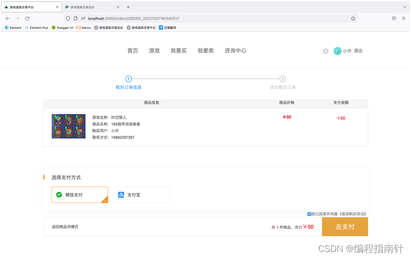 4)我要卖界面:用户同意相关平台规则,则可以进行发布商品。用户可以选择想发布的游戏,选择该游戏的道具分类,添加相关信息点击发布,便可把商品信息提交给管理员审核,待管理员审核完成,商品便真正被上架到游戏道具交易平台中的商品中;