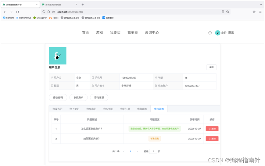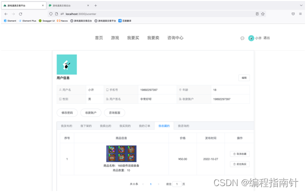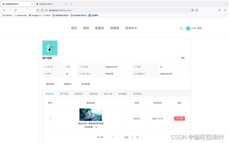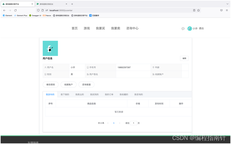 6)个人中心界面:当用户登录成功后,点击用户自己的头像便可以进入到用户的个人中心界面。在个人中心中主要有个人中心、商品管理、订单管理、用户收藏和用户咨询五个部分功能,在个人信息可以查看个人信息,进行修改个人信息,进行修改密码,设置收款帐号,咨询客服问题;在商品管理可以查看用户发布的商品,还可以查看用户下架的商品;在订单管理可以查看用户买到的商品,可以查看用户卖出的商品,还可以查看用户所有的订单;在用户收藏可以查看用户所有收藏商品,在用户咨询可以查看用户所有的咨询记录,查看管理员回复。