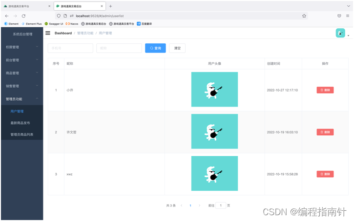 4)管理员功能模块:管理员功能模块包括用户管理、最新商品发布、管理员商品列表。其中用户管理展示了游戏道具交易平台中所有的前台用户,管理员可以对违反规定的用户进行删除操作;最新商品发布功能是可以让管理员去销售相关游戏的商品,可以更好更快的发布游戏道具商品,丰富商品的种类;管理员商品列表是可以查看管理自己发布的商品,可以对自己发布的商品进行编辑操作,也可以进行删除操作以便进行下架处理;