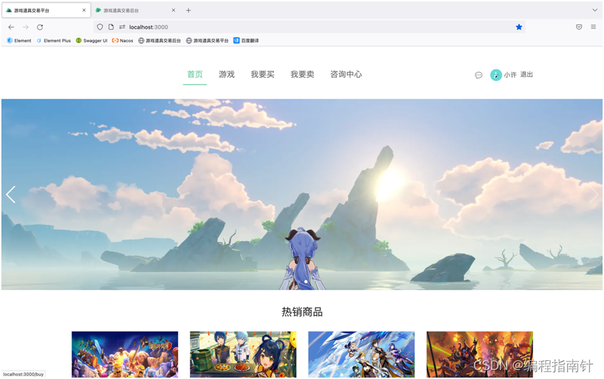 1)首页界面:游客可以在首页界面查看热销商品、查看热门游戏,可以通过点击热门游戏查看游戏详情;也可以通过点击热销商品查看商品详情;