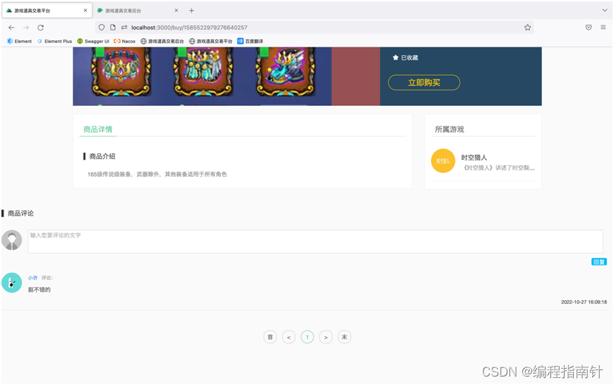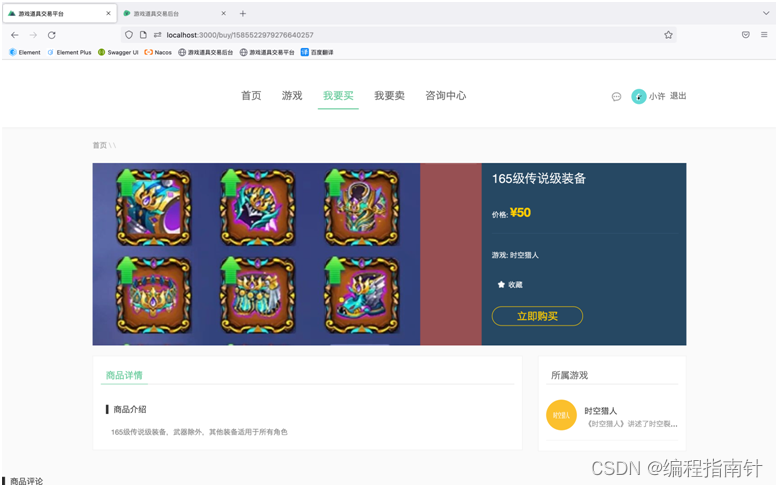 3)我要买界面:游客可以在我要买界面查看所有商品,并且可以通过分类筛选快速查找到相关商品,也可以通过切换商品页面进行查找商品;游客还可以点击其中一个商品,查看商品详情数据,还可以查看该商品所属于那个游戏;