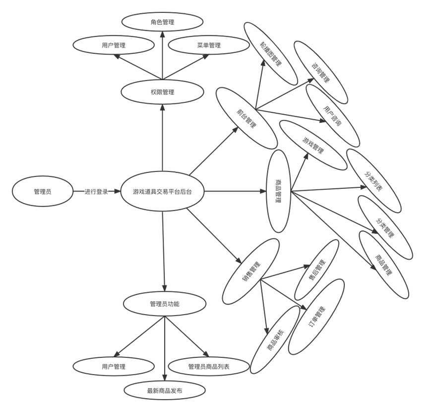 后台系统中主要功能:权限管理后台登录用户、管理前台轮播图、管理咨询、管理用户咨询、管理游戏、管理分类、管理商品、审核商品、订单管理、售后管理、前台用户管理、最新商品发布、管理员商品列表等功能。