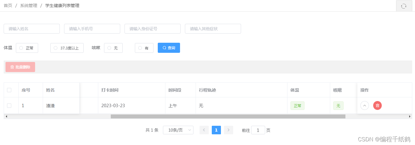 本次开发和设计的校园疫情管理系统,主要切合目前互联网时代己进入WEB3.0的新时代,利用新技术新思路为学校的信息化建设添砖加瓦。系统的整体功能按原先的任务书要求己经实现了相关的核心业务功能,包含前端用户操作界面和后台管理界面,主要围绕用户、教师、管理员三个用户角色的业务操作功能来进行开发和实现,基于前期的需求分析,己经完成学生管理、教师管理、健康打卡、离校审核等业务模块的开发和测试。