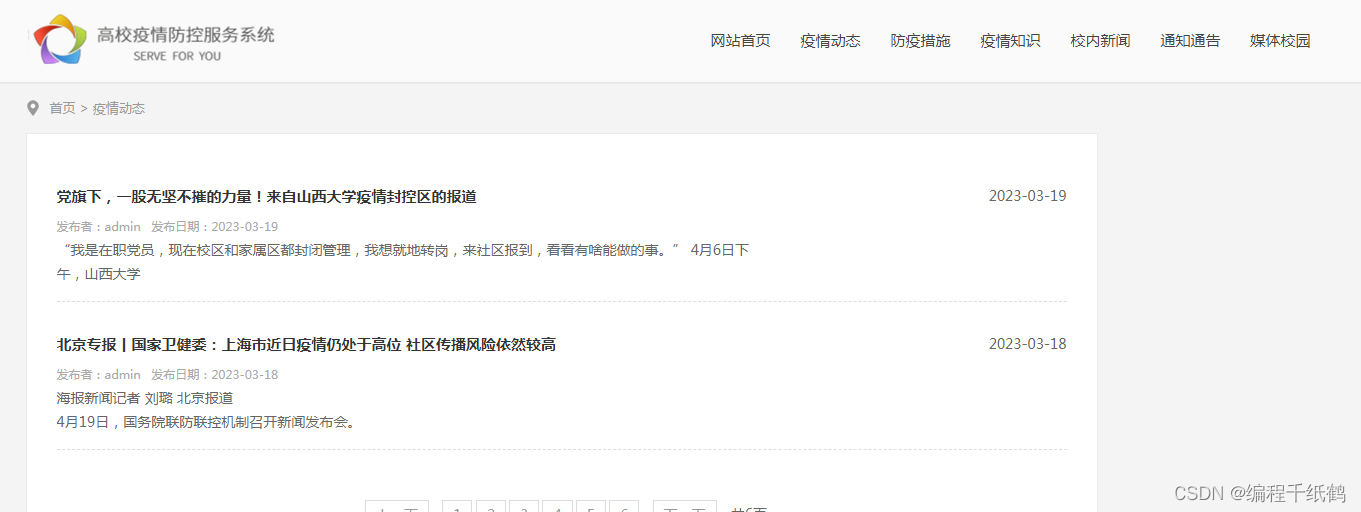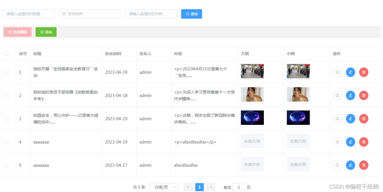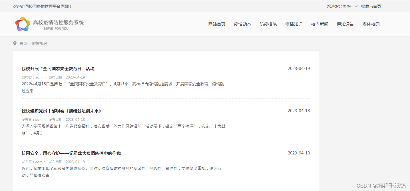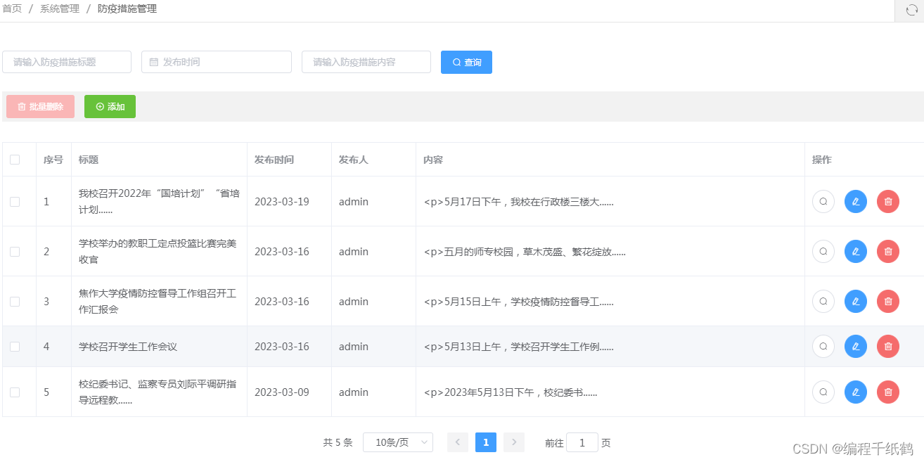 疫情知识管理主要对学校发布的疫情相关的知识信息,进行相关的信息管理。界面展示如下图4-3所示: