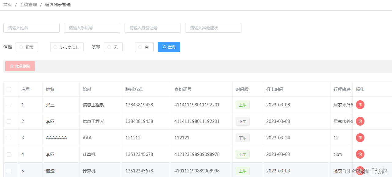 管理员登陆系统后,可以将已经确诊的学生和老师进行上报,被上报的学生和老师会在确诊列表中进行查看,可以根据组合条件查询来进行查看。具操作界面如下图4-9所示: