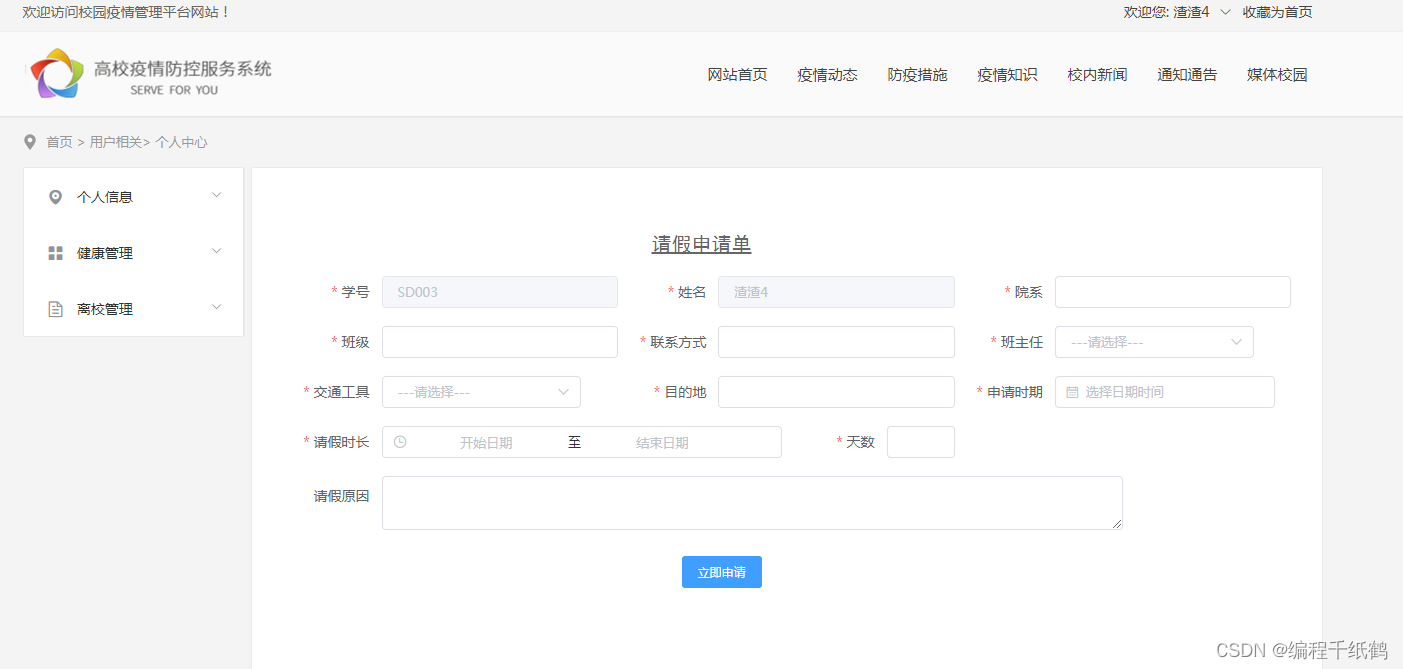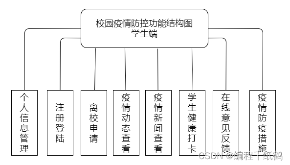 (3)学生角色模块:主要包含对学生个人信息管理,注册登陆,离校申请,查看疫情动态,疫情新闻,在线健康打卡等功能。