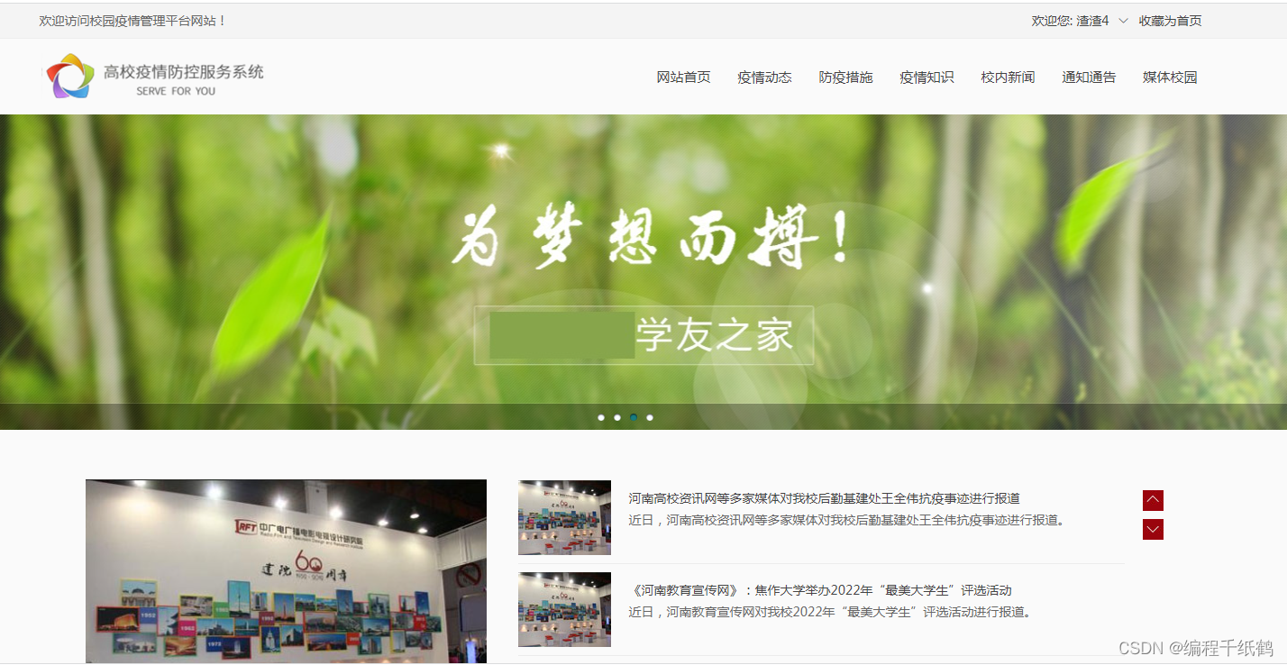 学生和老师登陆系统后自动跳转到系统首页,可以根据菜单分类进行信息浏览,首页布局主要展示相关轮播图和新闻信息。操作界面如下图4-12所示: