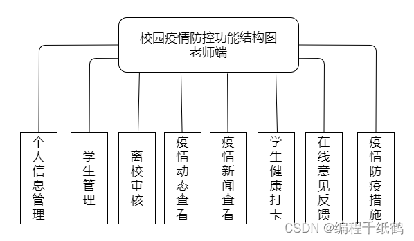 (2)老师角色功能:主要包含对个人的信息管理,学生管理,离校审核,疫情新闻,疫情动态,学生健康打卡等功能模块。