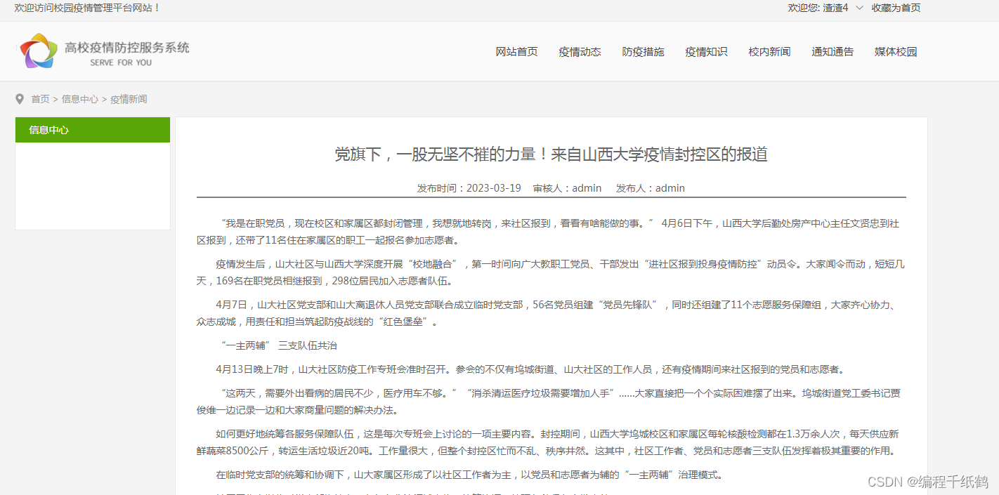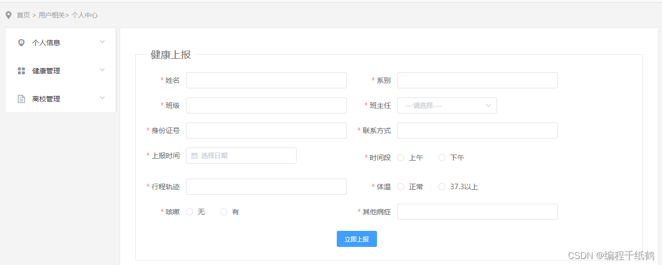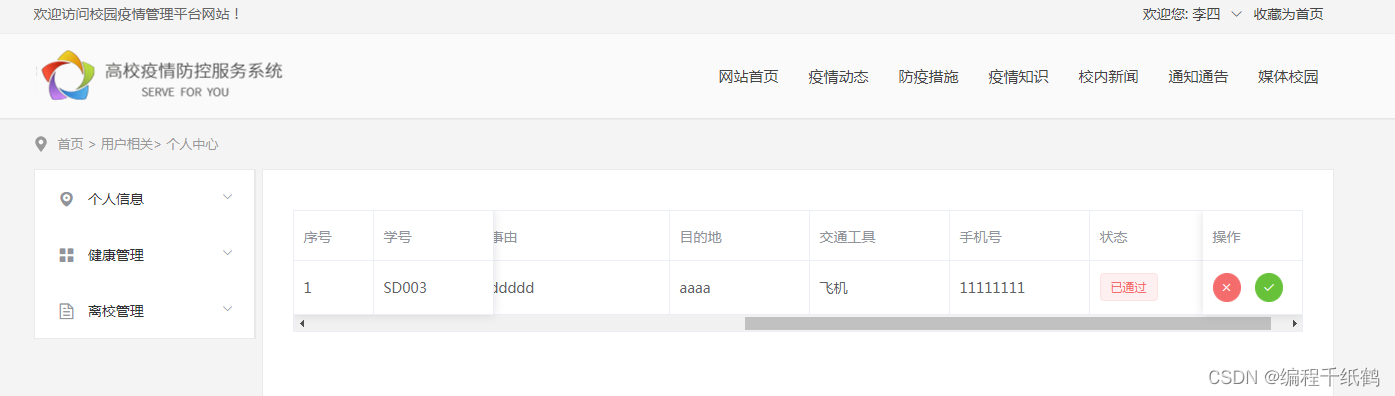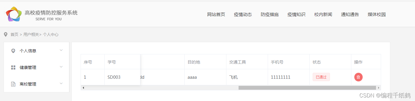 全国各类学校数不胜数,学生数量之多,增加了管理的复杂度,通过信息化技术的手段应用,可以有效的进行信息的收集和集中处理,解决校园管理人手不够的问题。另外通过信息化数据的沉淀和整理,可以非常方便的对历史数据进行查询和回溯,方便进行信息的追查和上报。本课题主要实现对学生、教师等基本数据的管理,还有对学生离校申请,请假,健康上报的审核和管理,以及对疫情相关动态和新闻信息的宣传等。