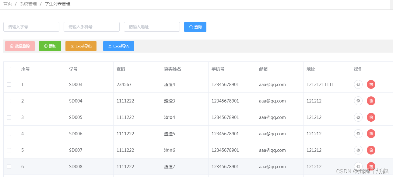 学生信息重置管理模块主要是对相校内的学生信息进行管理,在此页面除了可以对学生进行基于的信息管理操作外,还可以进行数据的导入导出,主要通过POI组件来实现将学生的信息导出来EXCEL表格,学生管理模块的相关管理操作界面如下图4-6所示: