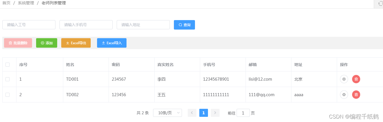 老师信息管理模块主要包含对学校内部的老师信息进行管理。系统管理员登录系统后,可以进入老师信息管理界面进行相关管理操作,主要包含对老师的添加、修改、删除和查询的相关管理操作,在此页面除了可以对老师进行基于的信息管理操作外,还可以进行数据的导入导出,主要通过POI组件来实现将老师的信息导出来EXCEL表格。后台老师管理模块的相关管理操作界面如下图4-5所示: