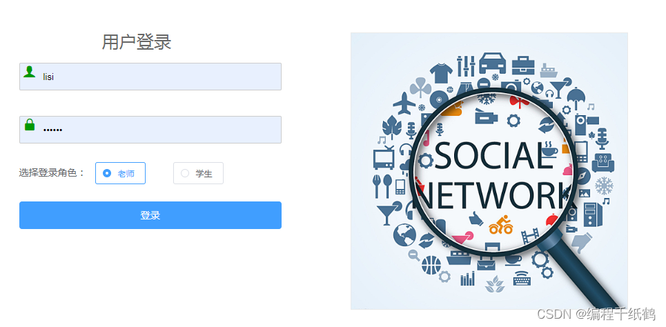 学生和老师在后台管理员处被添加后可以在系统的前端页面进行登陆,登陆时选择自己的身份信息。用户登陆界面如下图4-11所示: