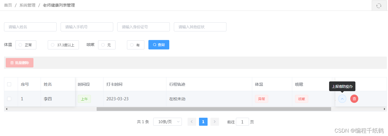 教师登陆系统后可以在学生健康打卡功能模块中查看当前所有学生的健康打卡信息列表,并可对打卡异常的学生记录进行上报操作。操作界面如下图4-8所示: