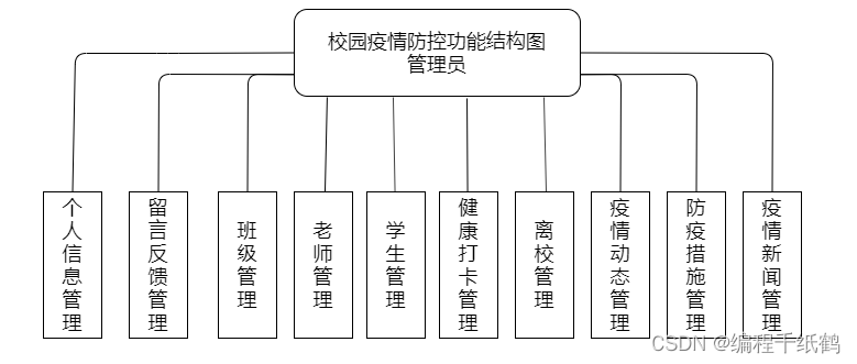 (1)管理员功能:平台的管理员可以管理系统的一些基本数据,主要包含管理员个人信息管理,班级管理,老师管理,学生管理,健康打卡数据管理,离校审核,疫情动态,疫情新闻,防疫措施管理等模块。
