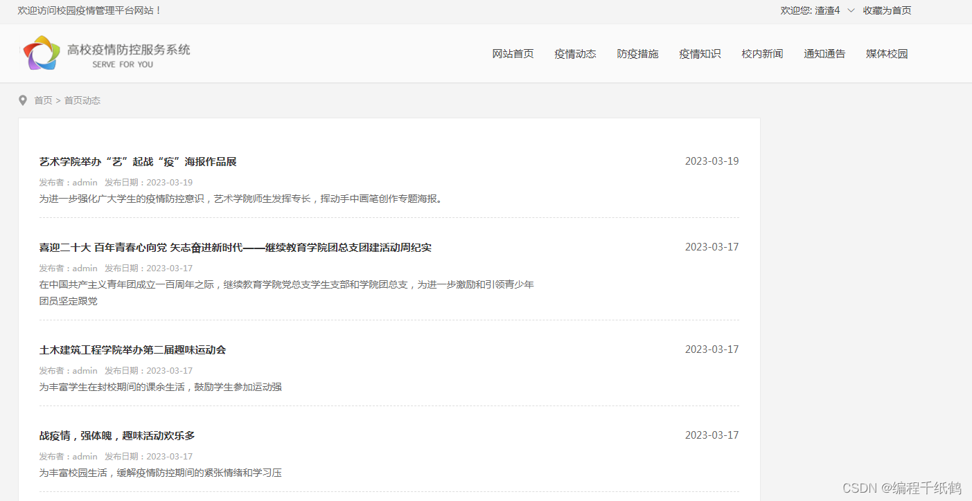 学生和老师用户进入系统后可以点击疫情动态模块查看后台发布的疫情动态列表和详情信息。具体操作界面如下图4-13、4-14所示: