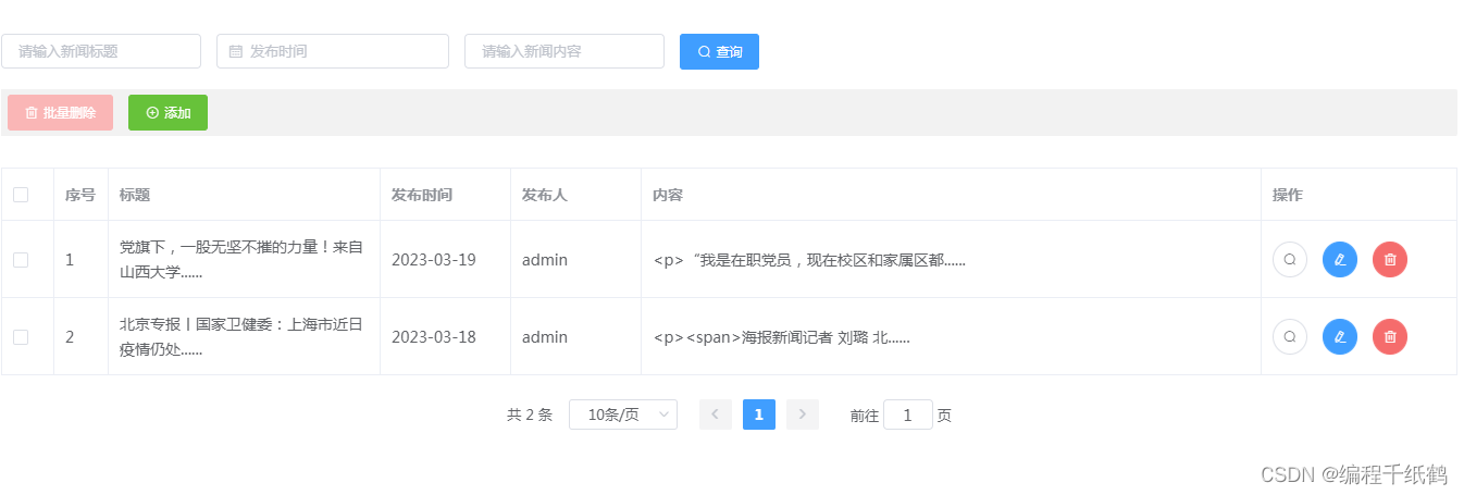 管理员登录系统后,可以对疫情动态信息进行维护:包括添加疫情动态信息、修改疫情动态信息、查询疫情动态信息、删除疫情动态信息等操作。疫情动态管理主要对学校当前的疫情控制的动态信息进行信息管理,管理员登录后台进入疫情动态管理操作界面,在此模块可以实现对疫情动态信息添加、修改、删除,并可以根据名称进行查询等管理操作。界面展示如下图4-1所示: