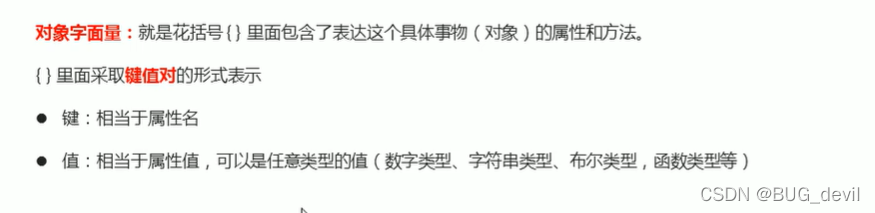 // (1) 里面的属性或者方法我们采取键值对的形式 键 属性名 : 值 属性值