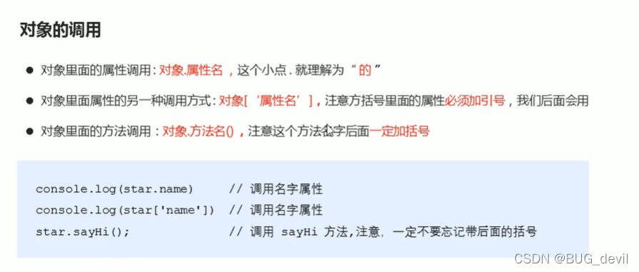 // (1) 调用对象的属性 1. 对象名.属性名 2.对象名['属性名']