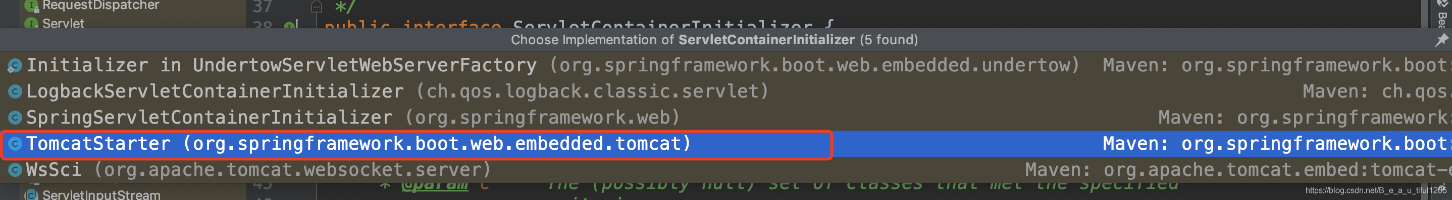 这个过程是在调用Servlet初始化器。ServletContainerInitializer是一个servlet规范中的接口,这里调用的是TimcatStarter的这个实现: