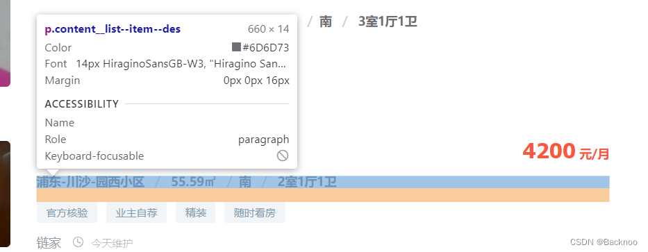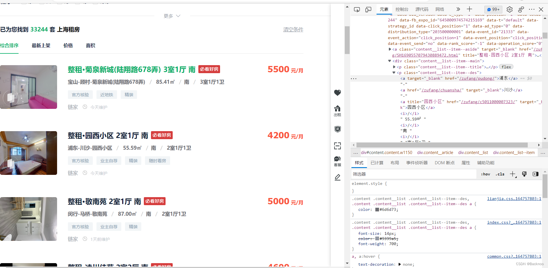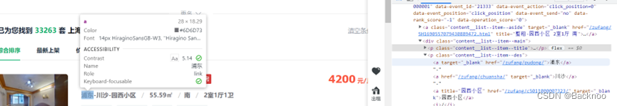 打开链家网页:https://sh.lianjia.com/zufang/ :用F12以页面中元素进行检查,点击左上角的小箭头,得到相关信息。