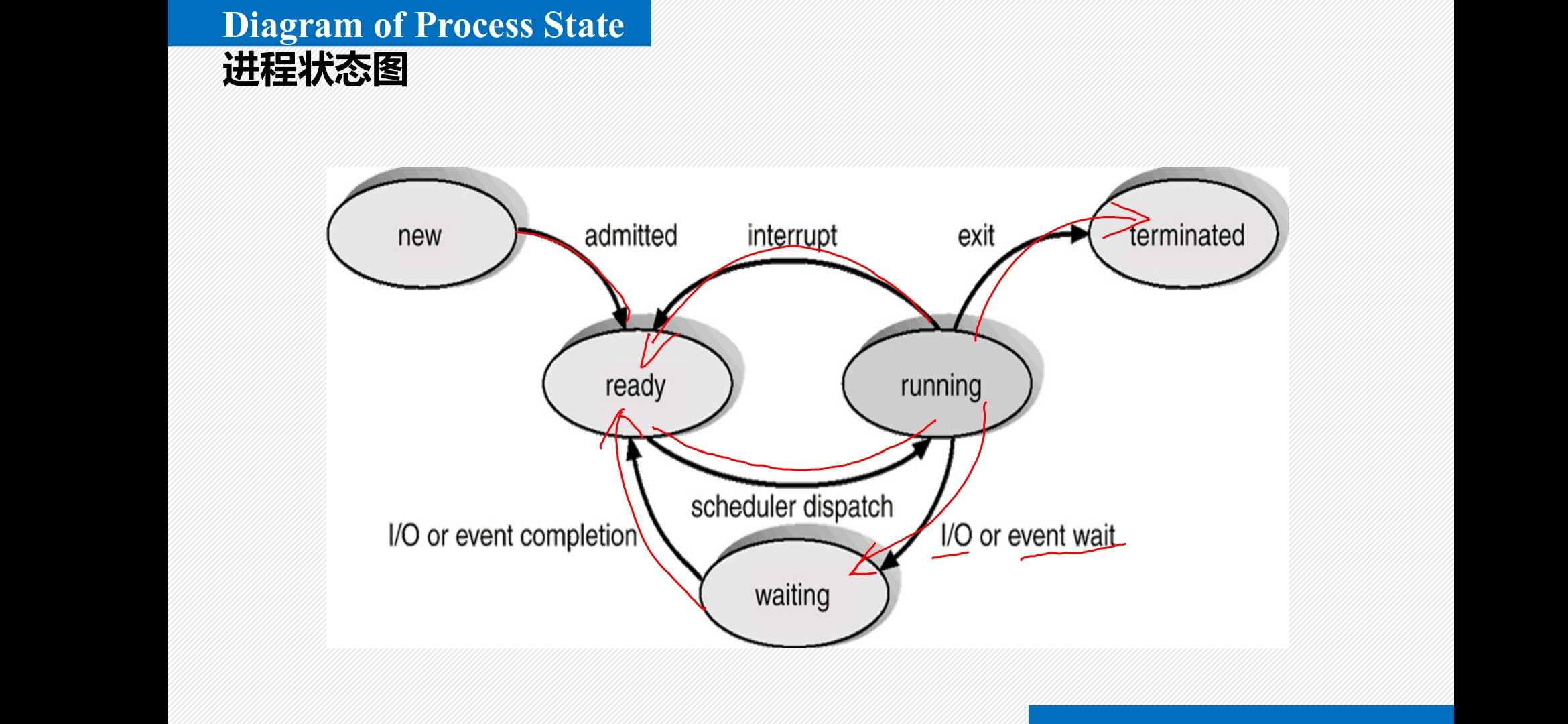 - 等待:进程等待某些事件发生;进程正在等待某个事件的发生(如等待I/O完成),而暂停执行,即使给它CPU时间,它也无法执行