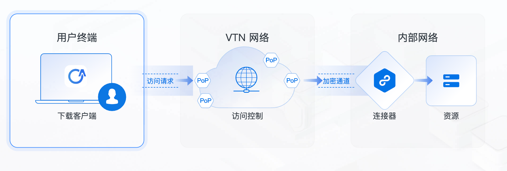 下载、安装并登录客户端,即可实现通过 VTN 网络安全、快速访问到您的资源。