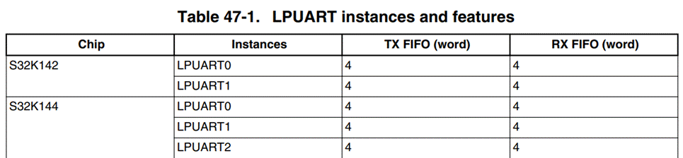 S32K144可以有三个 LPUART 实例,发送、接收数据缓存区为 4 字节