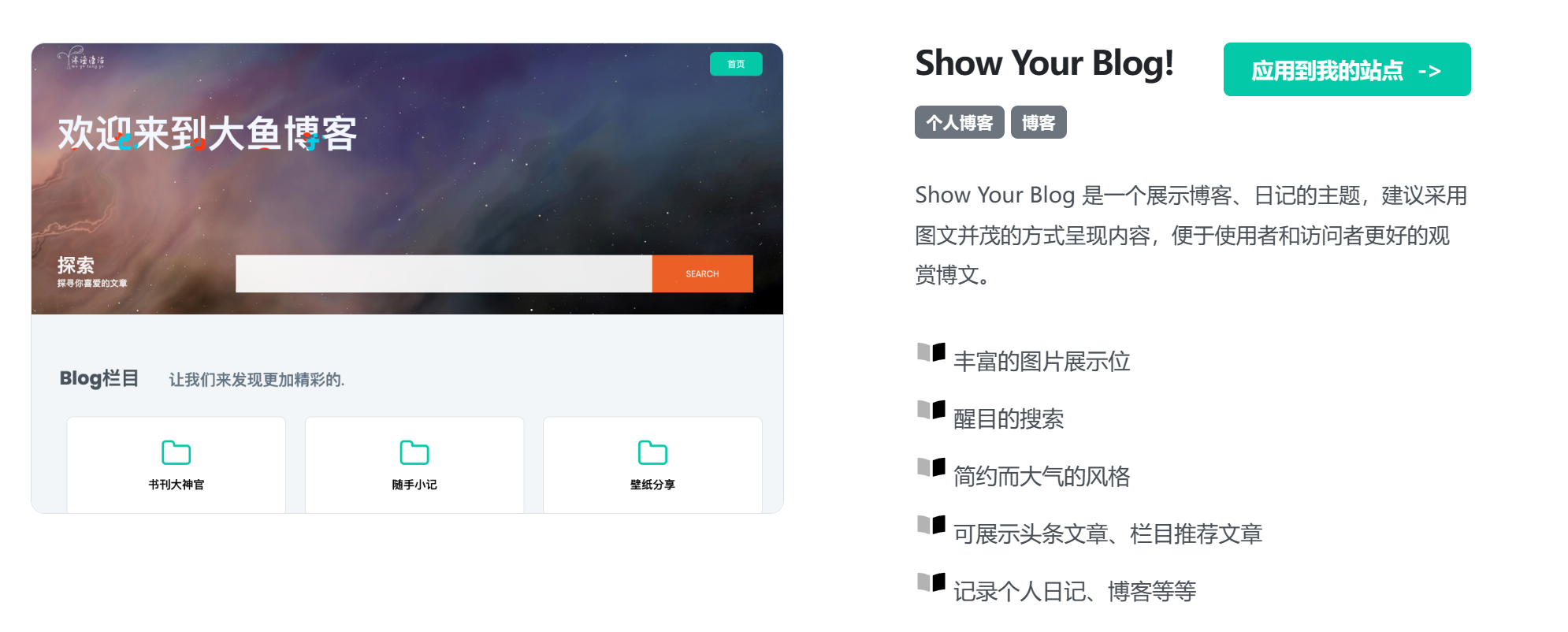 Baklib是一款在线的文档编辑及内容分享工具,不仅为用户提供了好用的知识整理平台,还提供了优质的知识发布平台,通过其制作的文档内容会自动转化成网站,通过设置的url链接就能进行访问,方便客户在线观看,帮助他们对产品的理解,为用户使用提供便利。 Show Your Blog 是一个展示博客、日记的主题,建议采用图文并茂的方式呈现内容,便于使用者和访问者更好的观赏博文。