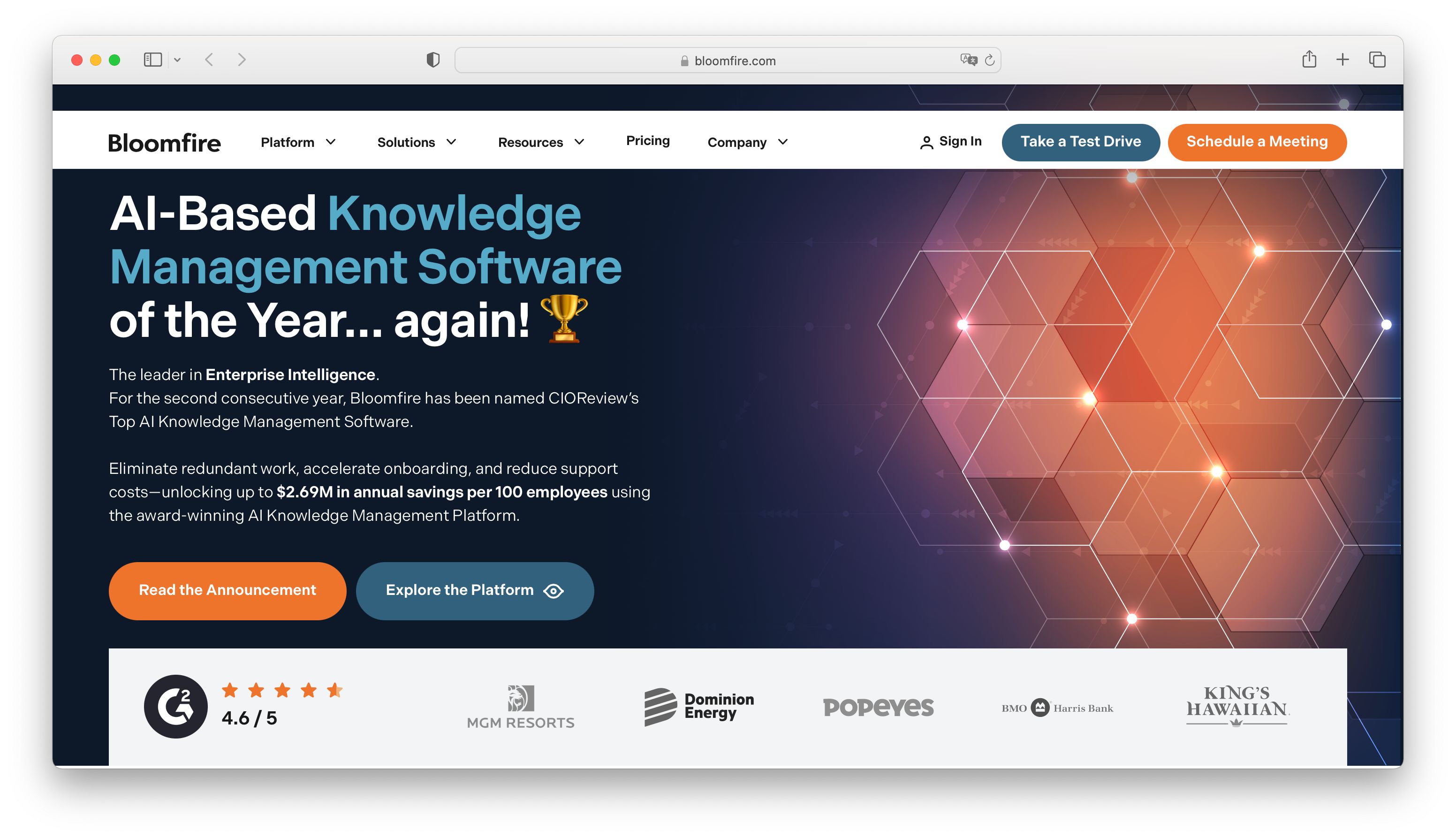 成立于2010年的Bloomfire是一个知识共享平台,帮助团队捕获、组织和分享知识。他们的使命是开发创新的网络应用程序,提升工作场所的在线知识与洞察共享体验。该平台包含搜索、分析和社交学习等功能。