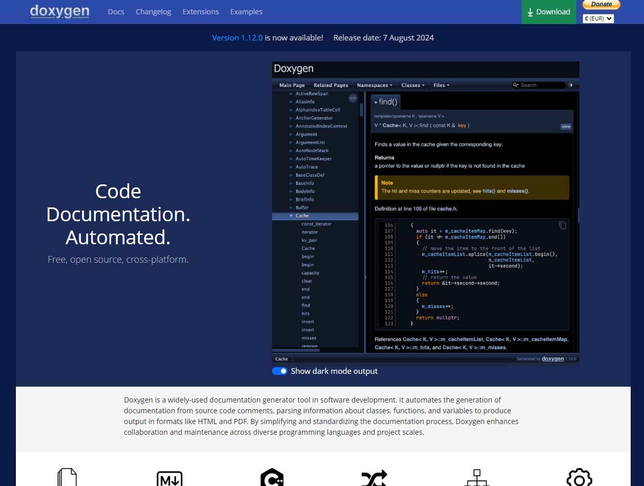 Doxygen 是一款免费开源的自动化技术文档生成工具。该软件通过扫描源代码中的函数、类和变量注释,自动生成详细的技术指南,并在需要处插入代码示例和描述。这意味着开发者需要在编写代码时添加规范的注释,但一旦熟悉后,Doxygen 能帮助快速创建 API 文档。
