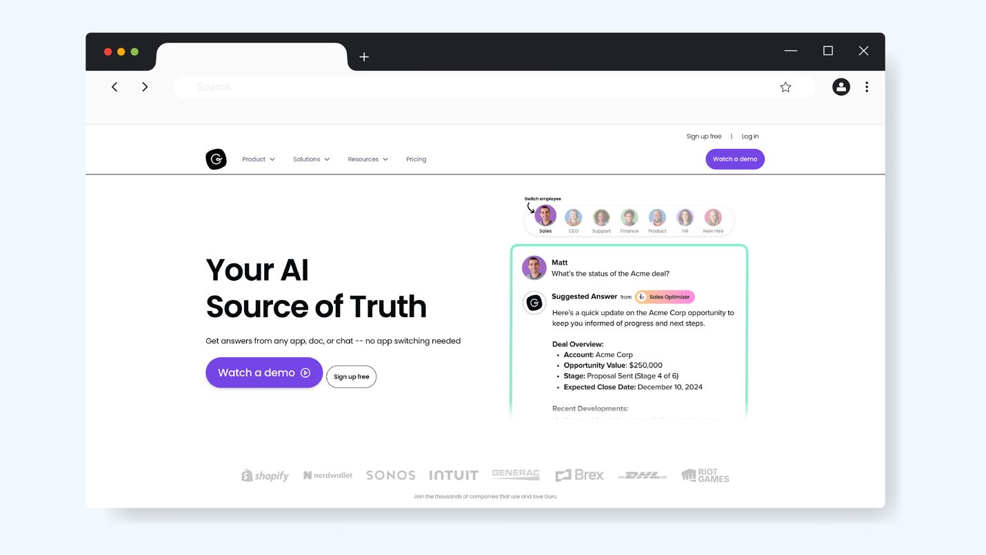 企业级AI搜索:Guru的生成式AI搜索帮助员工从不同来源获取准确信息。它能聚合来自所有企业应用程序的信息并集中展示。