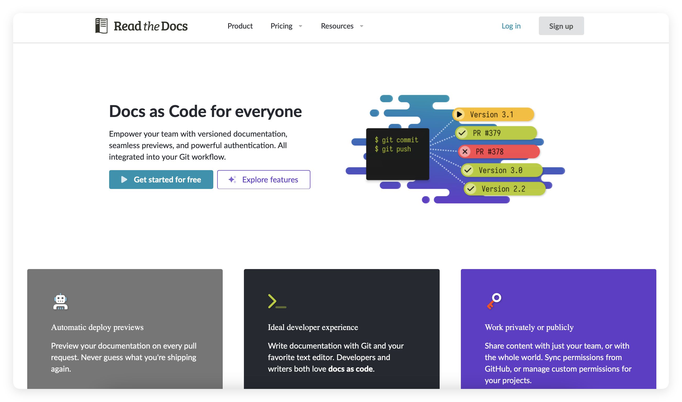 ReadTheDocs还提供版本控制、数据分析功能,并能与GitHub和Bitbucket集成。它支持创建搜索索引,便于用户在文档中快速定位信息。另一优势是其易用性——简洁直观的界面让技术与非技术成员都能轻松上手。