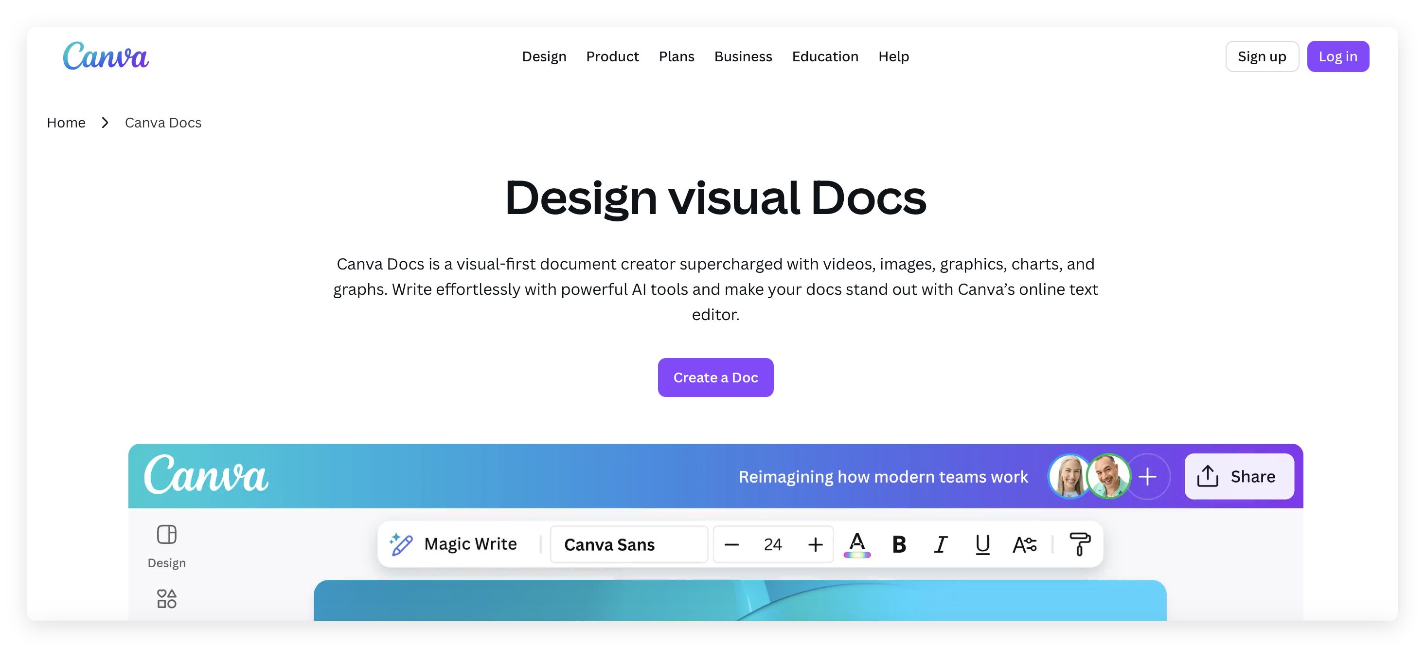 Canva Docs 是 Canva 推出的在线文档工具,结合了文档编辑与视觉设计。用户可在文档中无缝插入图形、图表与视频,适合需要强调品牌视觉与营销内容的团队。
