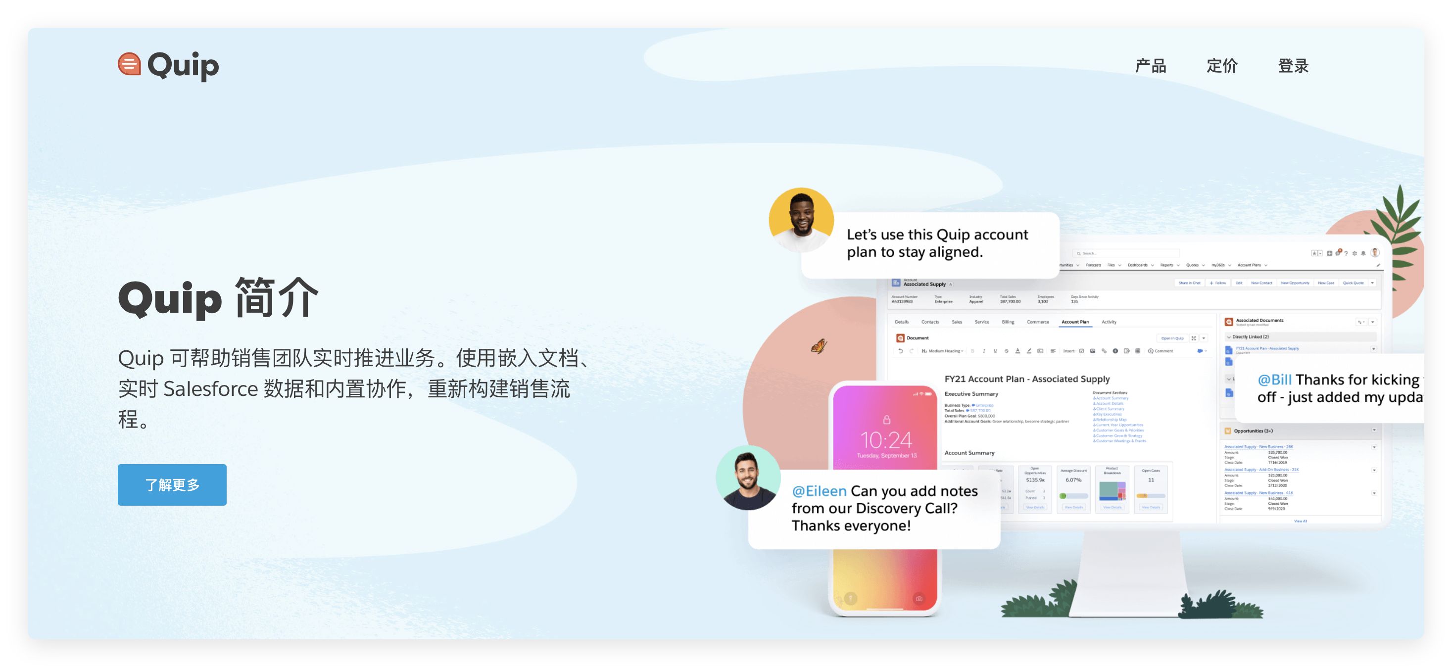 Quip 是 Salesforce 旗下的协作文档平台,结合了文档、电子表格与聊天功能,专为企业团队协作与业务流程优化而设计。
