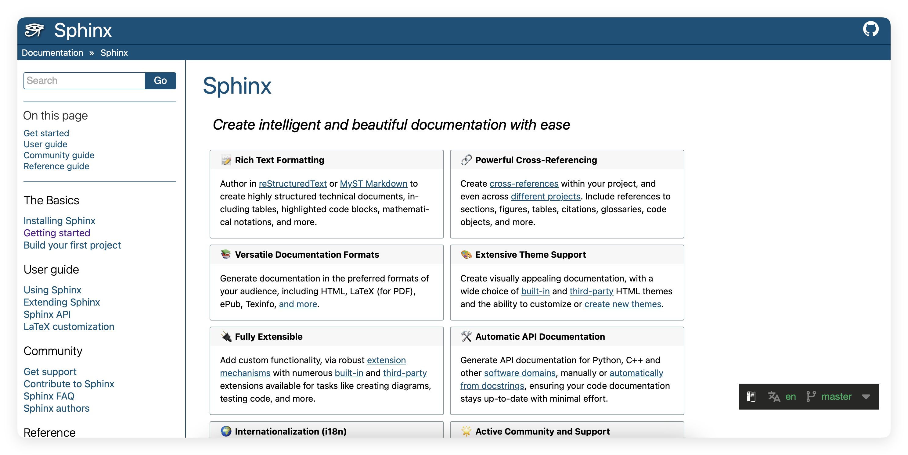 Sphinx的核心优势在于对reStructuredText标记语言的深度支持,既能创建带交叉引用和代码文档的结构化内容,又可输出多格式文档。其可视化定制能力和国际化支持,使其成为跨语言文档创作的理想工具,与现有工作流的无缝集成更简化了文档的全生命周期管理。