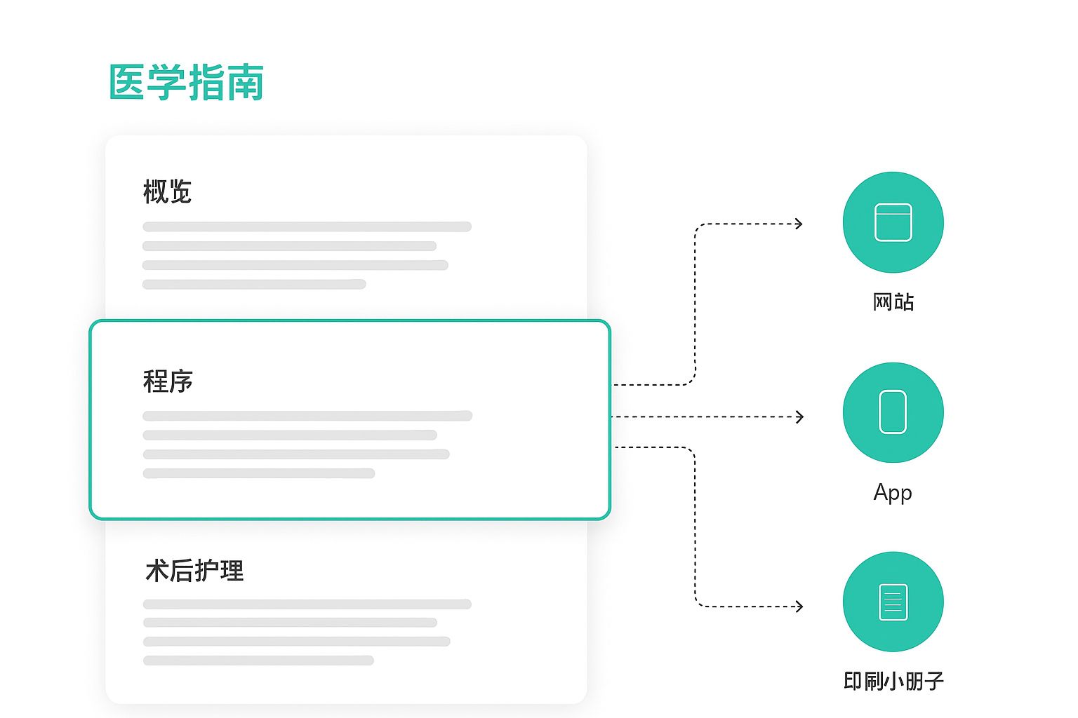 医疗指南可被拆分为概述、操作流程、术后护理等可复用模块,每个模块都能跨渠道、跨内容灵活调用。