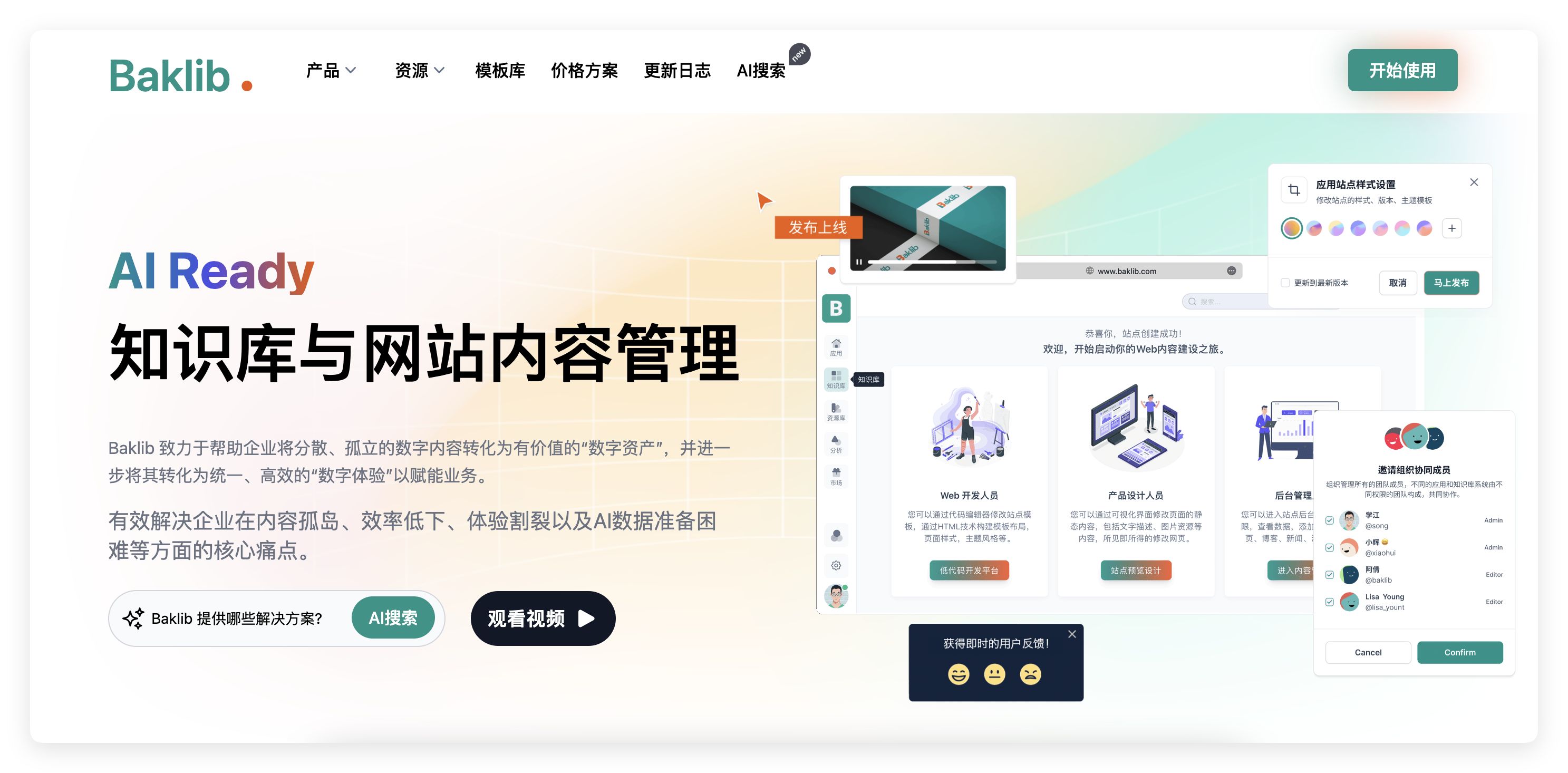 Baklib 是一款同时具备知识库 + 网站内容管理能力的一体化平台,提供智能搜索、结构化文档、内容协作等功能,帮助企业快速构建高质量知识体系。