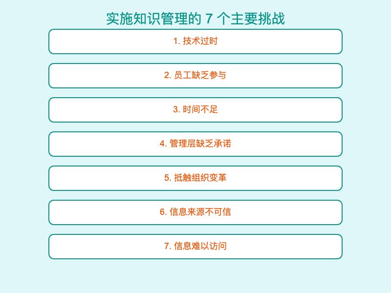 尽管有这些好处,但组织在组织中实施知识管理时仍面临障碍。知识管理提出了许多挑战。我们将在本节中介绍一些最常见的内容。