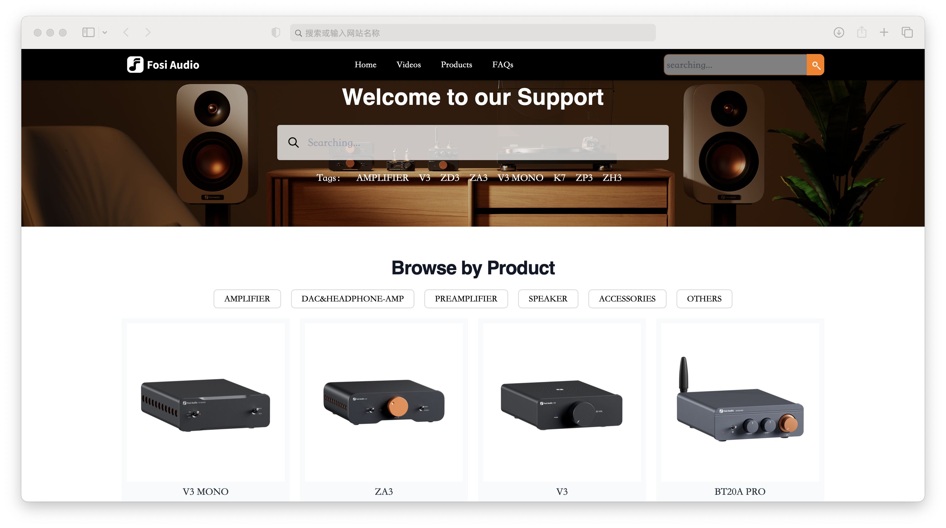 其支持页面上能看到“Browse by Product”“Browse by Topic”这样的分类。同时按产品型号(如 V3 MONO、ZA3、K7 等)和类别(放大器、DAC & 头戴耳机放大器、前置放大器、扬声器、配件等)查找常见问题与文档。