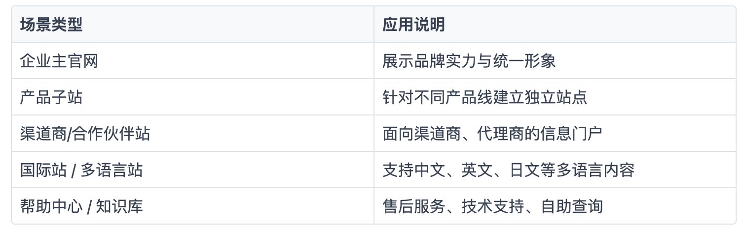 基于平台内容中台能力,企业可快速搭建更多延展网站: ✔ 产品文档中心 ✔ 客户服务门户 ✔ 内部知识库 ✔ 学习培训平台 ✔ 开发者 API 文档中心 ✔ 渠道运营平台